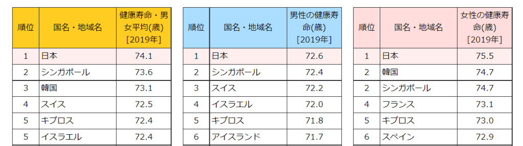 一方、2021年にWHOが発表した統計によると、日本人の健康寿命は男性72.6歳、女性は75.5歳です。男女平均は74.1歳となります。